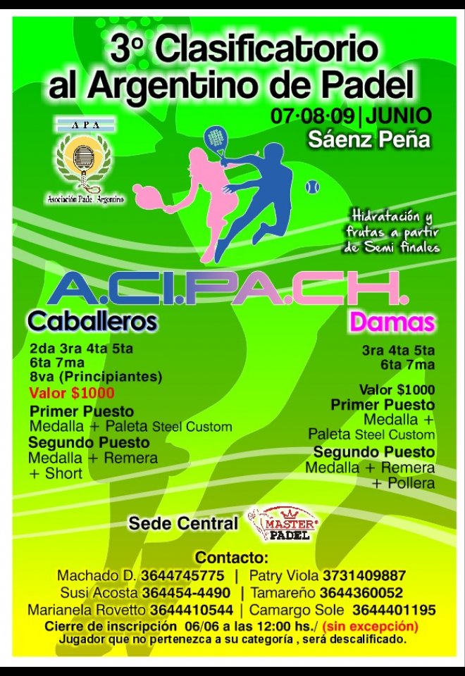 »» Evento: 3er Torneo Clasificatorio Acipach »» Localidad: Roque S. Peña »» Fechas: 07/06/2019 al 09/06/2019