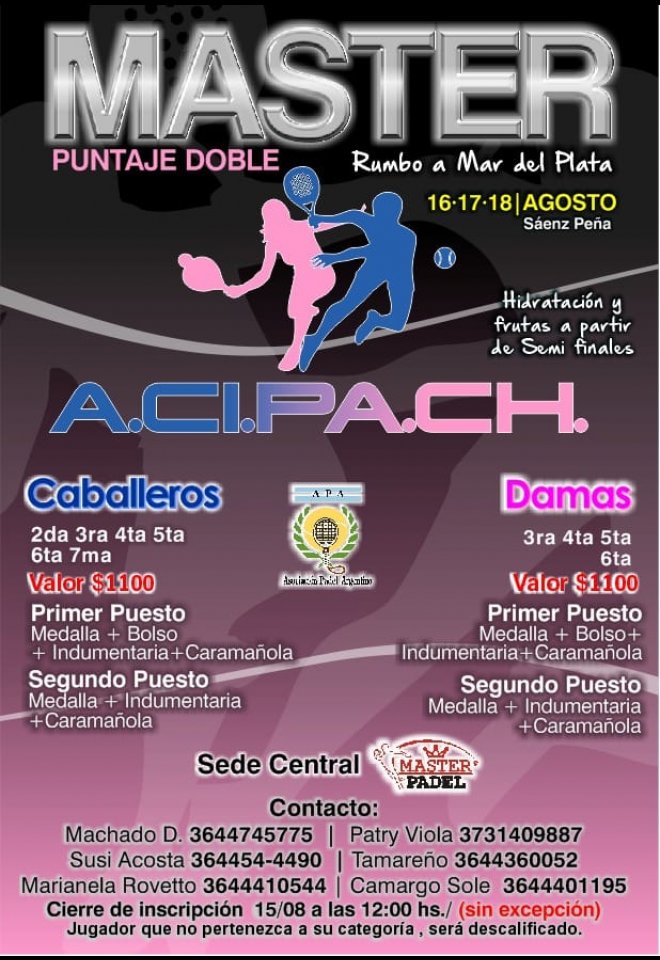 »» Evento: Master Acipach »» Localidad: Roque S. Peña »» Fechas: 16/08/2019 al 18/08/2019