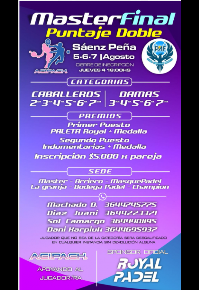 »» Evento: Master Final ACIPACH »» Localidad: Roque S. Peña »» Fechas: 05/08/2022 al 07/08/2022