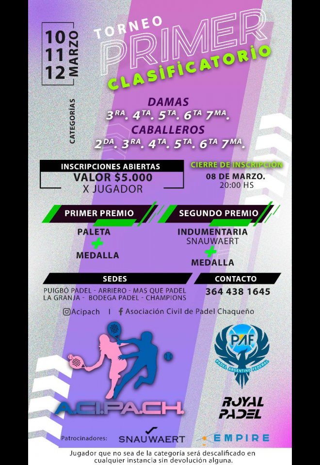 »» Evento: Torneo 1er Clasificatorio ACIPACH »» Localidad: Roque S. Peña »» Fechas: 10/03/2023 al 12/03/2023